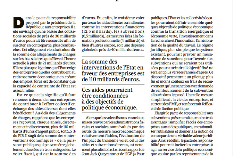 Contribution au Pacte de responsabilité : Proposition pour inscrire la notion de contrepartie dans un contrat d’objectifs avec les entreprises